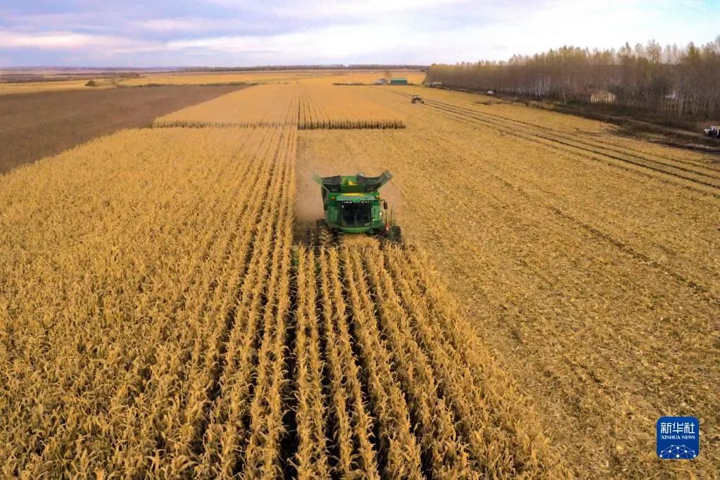 这是10月7日拍摄的黑龙江省绥化市北林区玉米收割现场(无人机照片)。新华社发(杨明辉 摄)